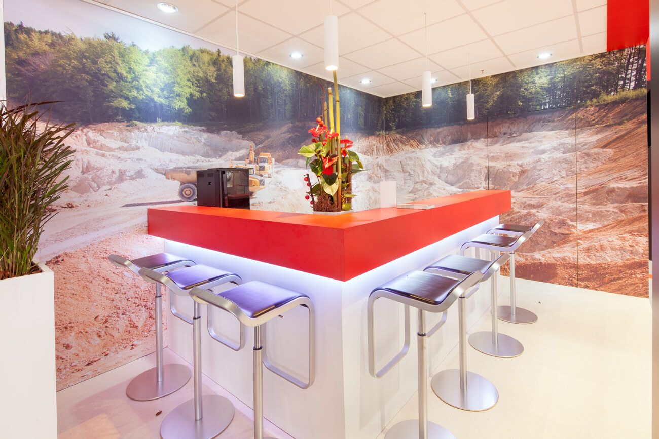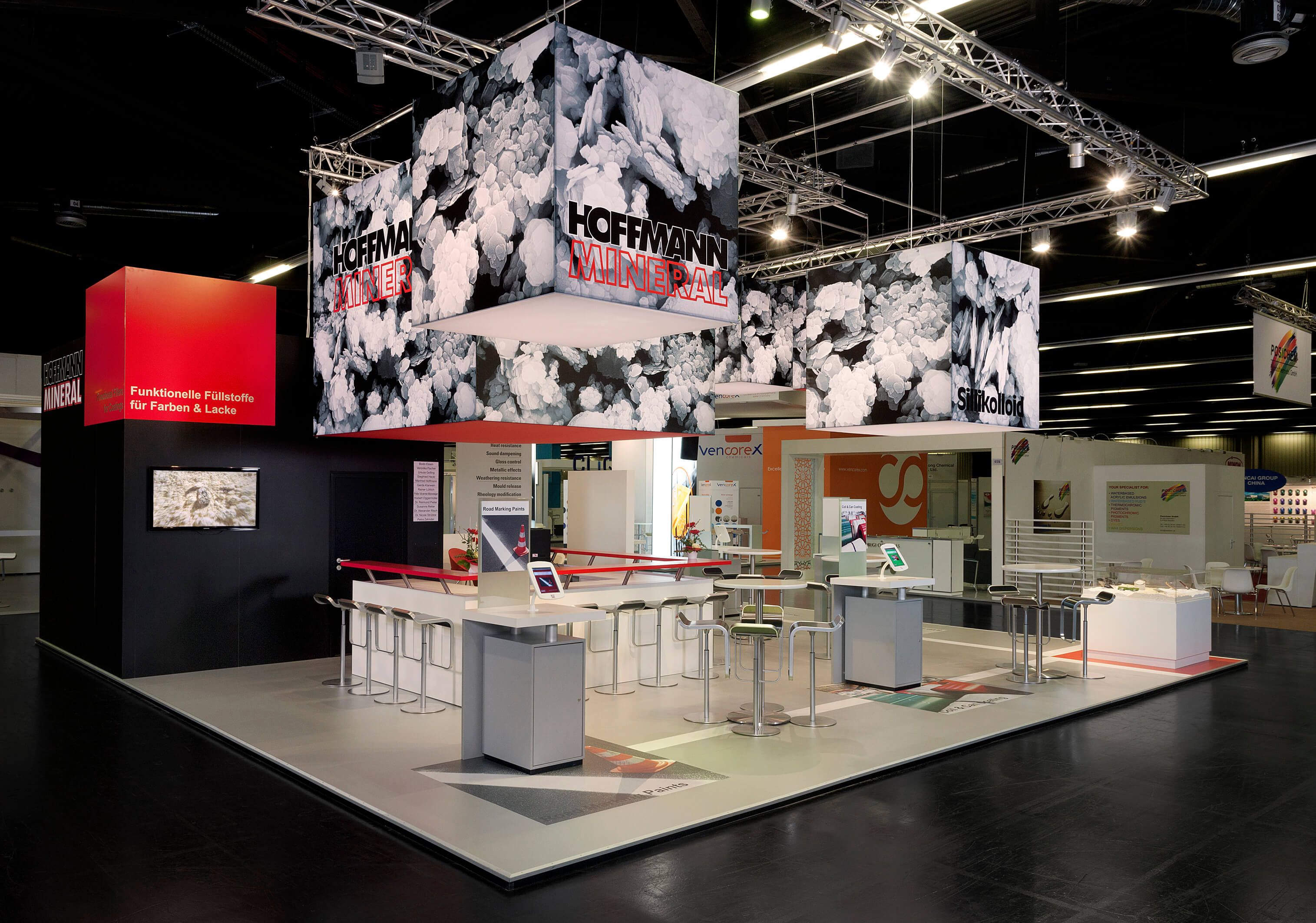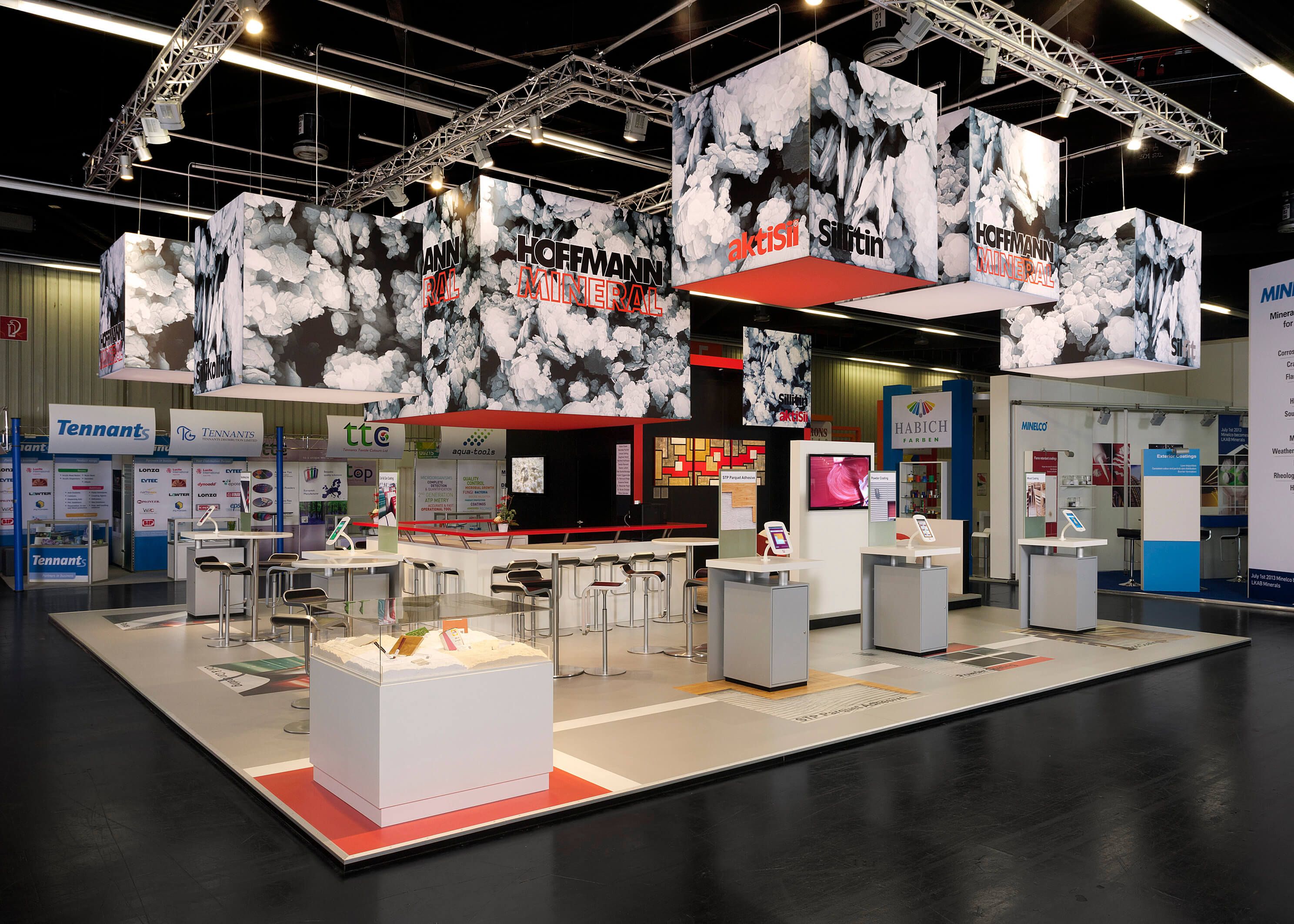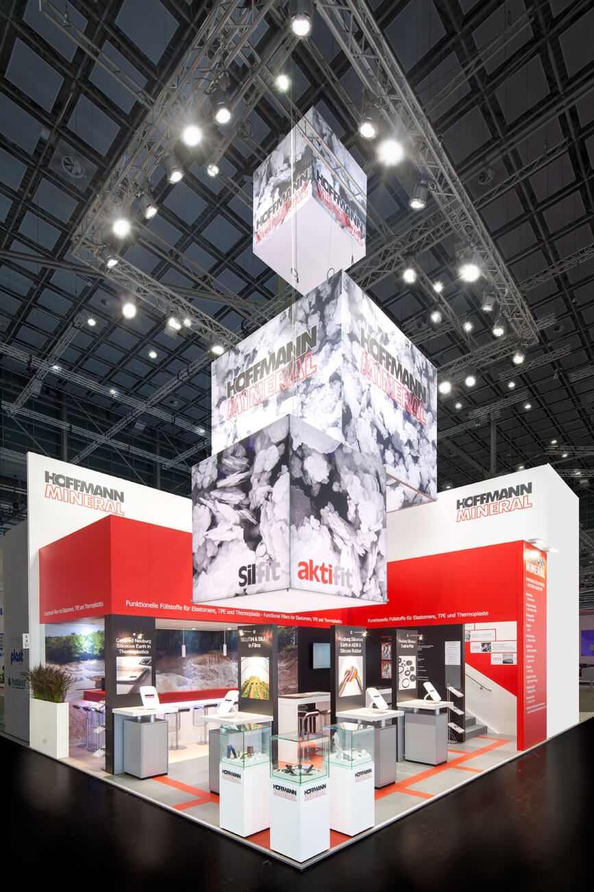Kunststoffmesse Düsseldorf und ECS NürnbergDie stoffbespannten Deckenkuben sind als markante eyecatcher mit dem Motiv einer mikroskopischen Vergrößerung der Kieselerde, die Hoffmann Mineral im offenen Tagebau abbaut, bedruckt